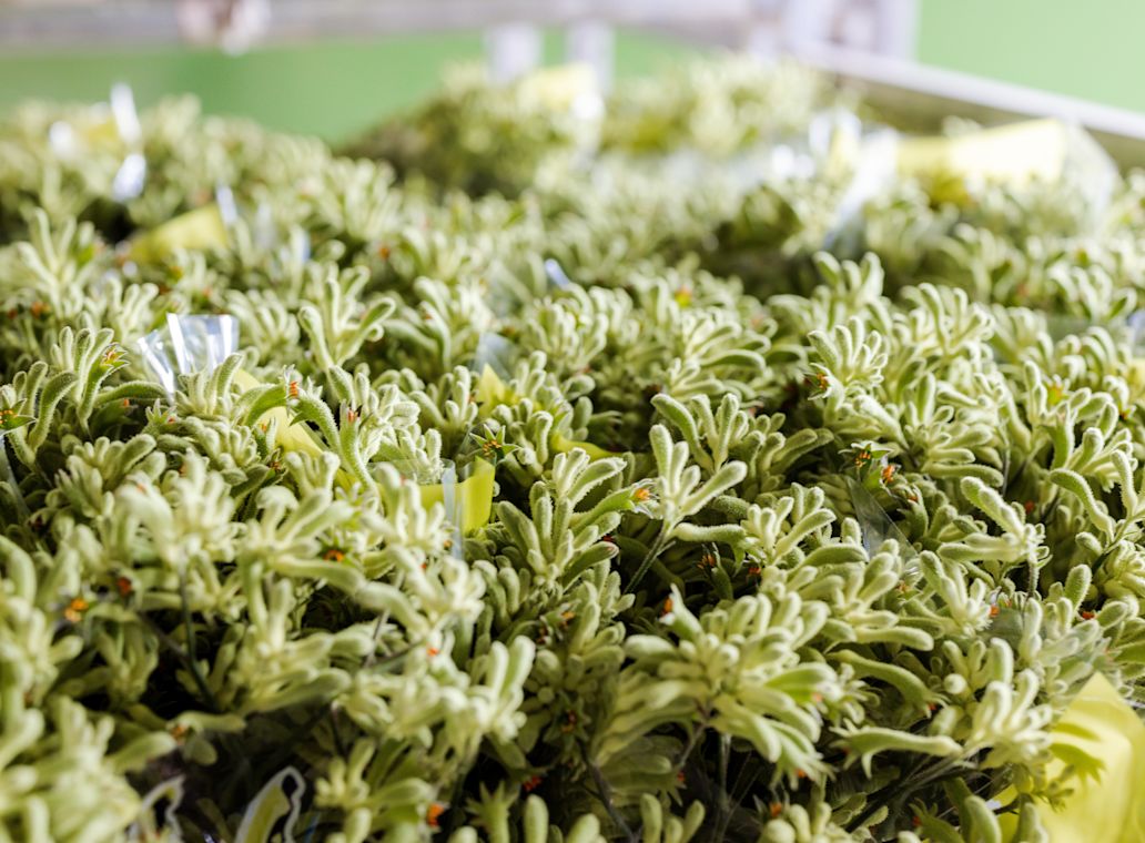 In der Halle stehen Bündel der künstlerischen Anigozanthos, bereit, an ihre neuen Besitzer verschickt zu werden. Neben den geraden Stielen gibt es Bündel mit Blumen, die in alle Richtungen wachsen. „Früher galt dies als Abfall, aber jetzt werden diese schiefen und verdrehten Varianten immer beliebter“, erklärt Renee. „Sie verleihen einem Bouquet etwas Besonderes, indem sie herausragen.“