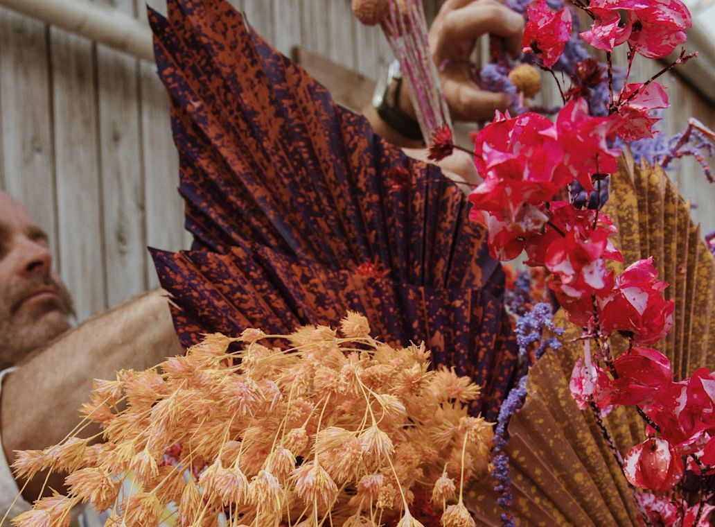 Jedes Jahr säen wir unsere Trockenblumen etwa im März aus und ernten sie Ende Mai. Die verschiedenen Sorten kommen bis Ende August ins Haus. Wir trocknen jede Blume sorgfältig, indem wir sie bei der richtigen Temperatur auf Hängewagen aufhängen. Die Trocknungszeit variiert von BlĂĽte zu BlĂĽte, je nach Dicke und Struktur. Dann kommt der Färbeprozess: zuerst eine tiefe Farbschicht als Basis, dann kontrastierende Schattierungen. Dadurch erhalten die Blumen einzigartige Muster. Wir verwenden umweltfreundliche Farbstoffe auf Wasserbasis, um das natĂĽrliche Aussehen zu erhalten.Â