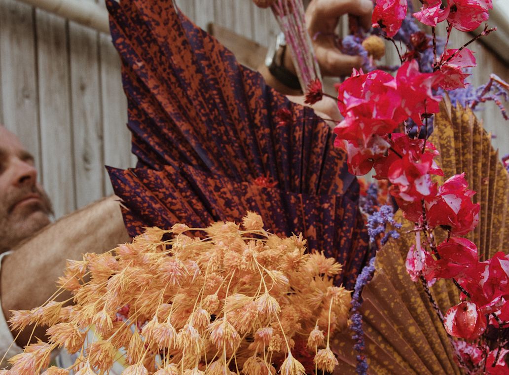 Every year, we sow our dried flowers around March and harvest them at the end of May. The different varieties come in until the end of August. We carefully dry each flower by hanging them on trolleys at the right temperature. The drying time varies per flower, depending on thickness and structure. Then comes the colouring process: first a deep layer of colour as a base, then contrasting shades. This gives the flowers unique patterns. We use environmentally-friendly, water-based dyes to preserve the natural look.Â