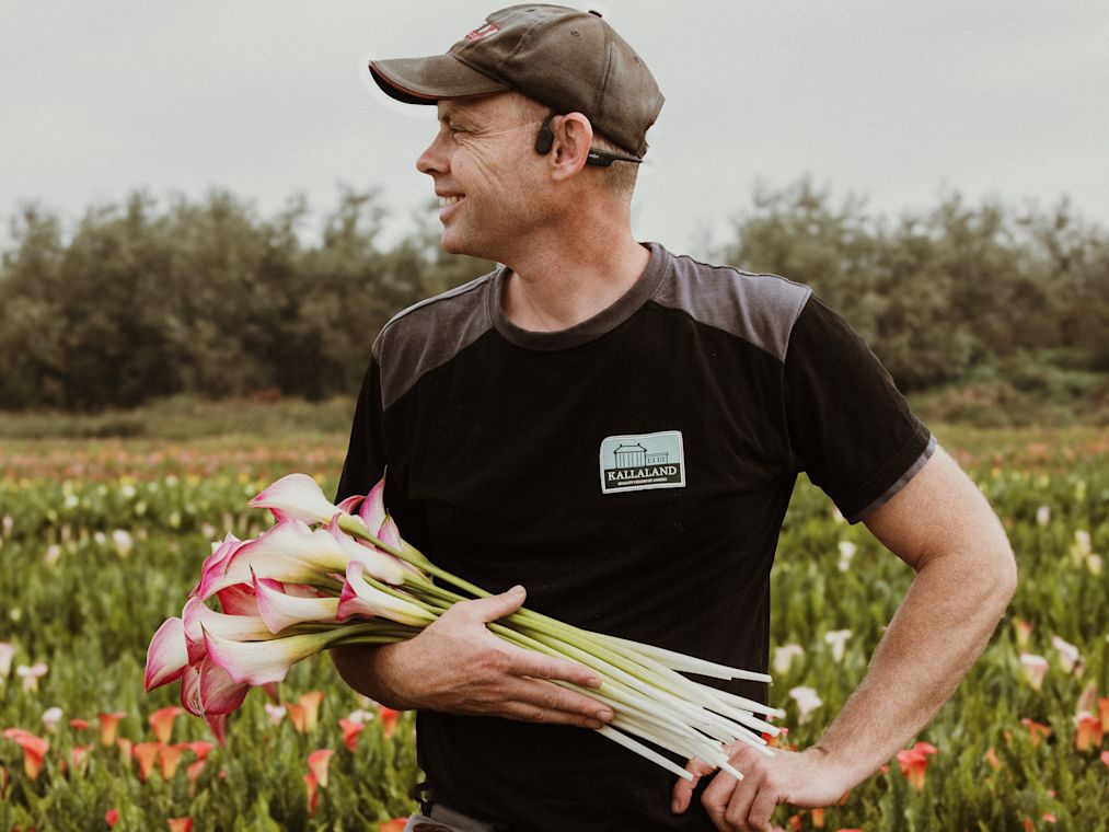 The peak season for callas occurs in August and September when the stunning flowers are lovingly hand-picked. Immense fields bloom with pink, purple, orange, yellow, and white callas, creating a spectacular sight. This year, Kallaland has dedicated approximately 35 hectares to the production of calla cut flowers and bulbs. We witness the harvesting process and learn how the bulbs are multiplied. This process takes several years and involves large tractors, sorting machines, and a great deal of manual work and care. Outside of the peak season, during which around 7.5 million stems are hand-picked in a short period, this process keeps the company busy year-round.