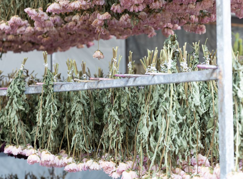 Om zowel de oorspronkelijke kleur als vorm te behouden, moeten de bloemen zo snel mogelijk drogen. De rekken vol verse bloemen worden daarom in een speciale droogcel geplaatst. Ventilatoren blazen warme lucht van 60 graden door de cel. Dit zorgt ervoor dat de bloemen binnen twee dagen perfect drogen. Het nieuwste warmtesysteem voorkomt onnodig energieverlies.